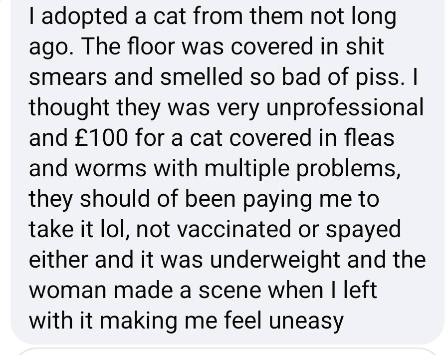 One volunteer shared how many cats had evidence of fleas, while claims have also been made that kittens were rehomed too early, and that cats aren’t being treated for fleas or worms.