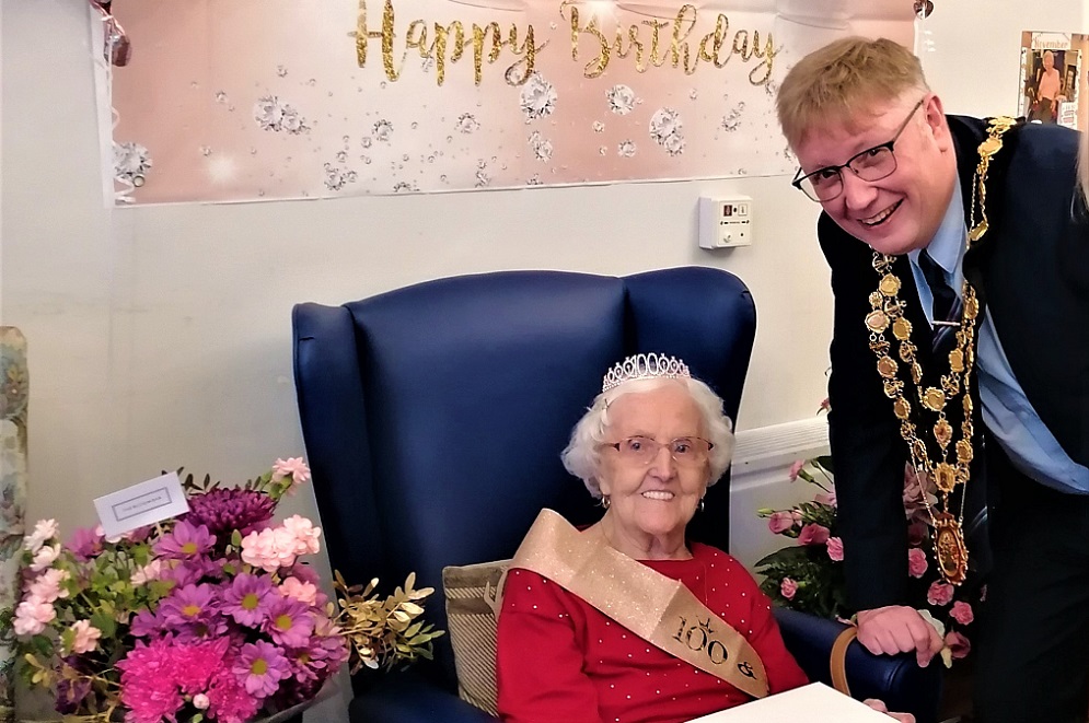 Mayor of Neath Port Talbot, Cllr Robert Wood, paid a visit to Afan Valley-born Lillian May Jones – to give his congratulations on her 100th birthday – at the Hollins Care Centre in Neath.