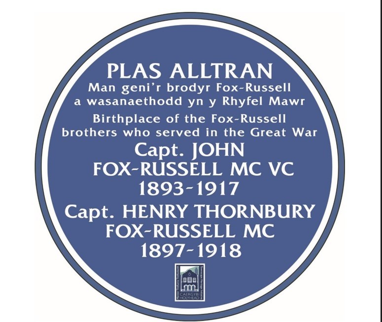 The plaque commemorates the birthplace of Capt. John Fox-Russell MC, VC (1893- 1917) and Capt. Henry Thornbury Fox-Russell MC (1897-1918).