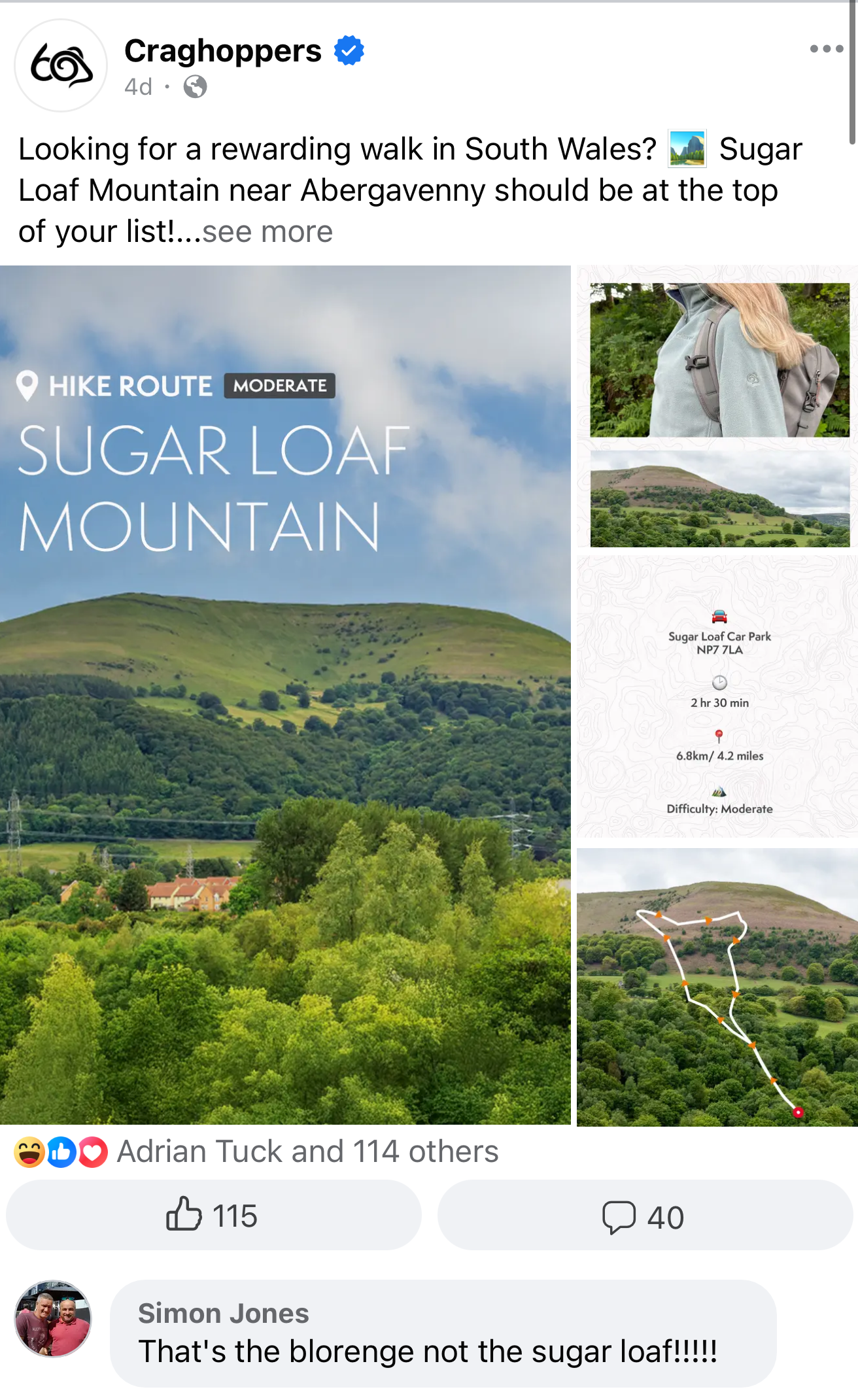 One such commenter wrote, “I suggest someone at Craghoppers turns the map around, thats the Blorenge not the Sugar Loaf,” while another helpfully attached an alternative route up Blorenge should readers want to hike the hill featured in the photographs.