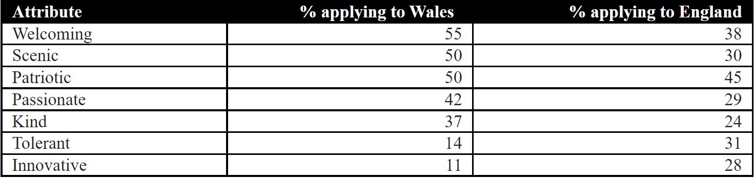 Wales was deemed by more people in England as being welcoming (55%) and passionate (42%) compared to 38% and 29% respectively who recognised those attributes in their home nation.