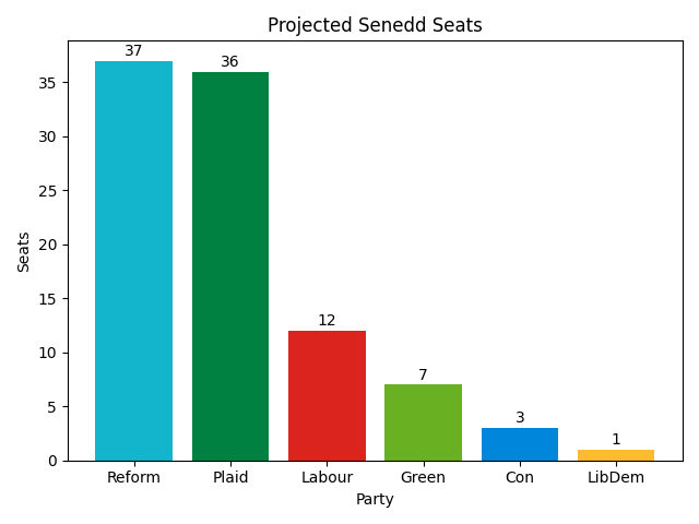 Modelling based on the new d’Hondt electoral system suggests Reform would win 37 seats and Plaid Cymru 36, leaving both short of a majority just over two weeks before voters go to the polls on May 7.