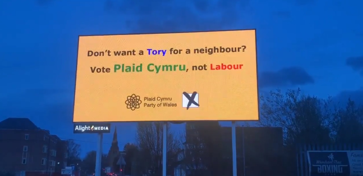 Carrie Harper, the party’s candidate in Wrexham, posted the public electronic billboard advert on social media which read “Don’t want a Tory for a neighbour? Vote Plaid, not Labour.”