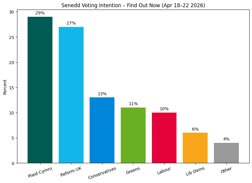 While both polls point to Plaid Cymru leading the field, the Find Out Now survey indicates a tighter contest with Reform UK and a sharper decline in Labour support, underlining the volatility of the race ahead of polling day.