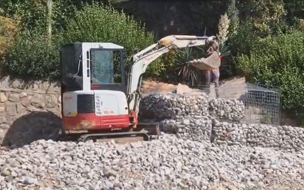 Concerns have been raised after a digger was used to scoop stones from a busy beach as scores of people enjoyed the August sunshine.