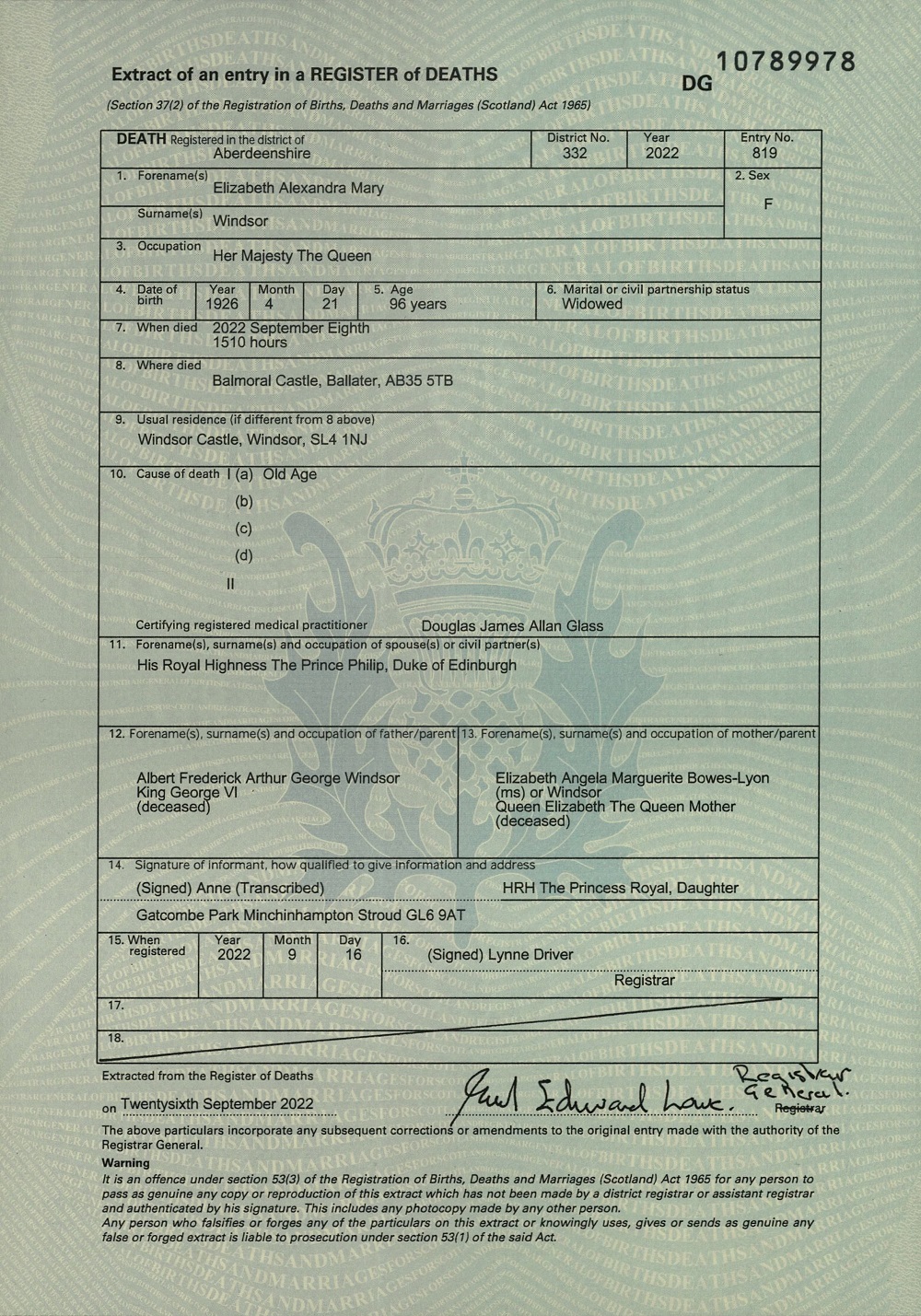 The cause of death is listed as old age, and the document is signed by Anne the Princess Royal.