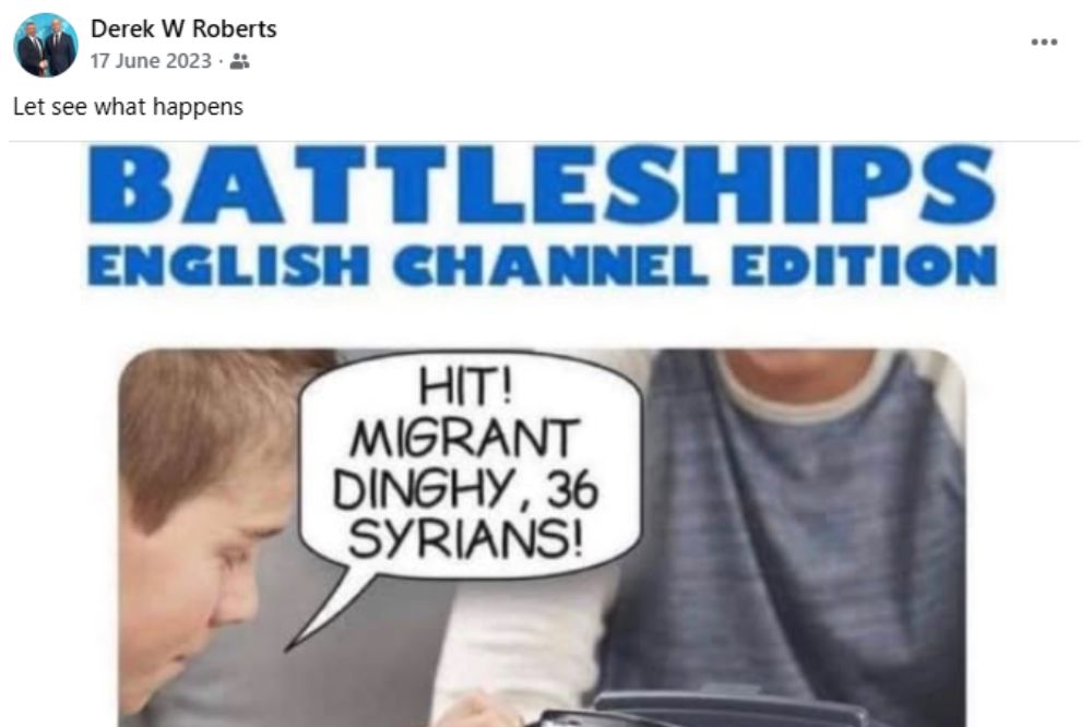 Sharing an image of a battleships game with the words, “hit migrant dinghy, 36 Syrians”, Roberts wrote: “Let see what happens.”