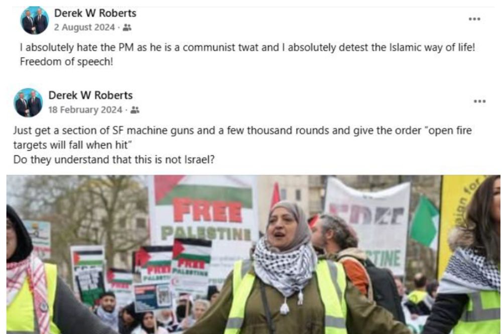 In one post, published in March 2024, Robert’s wrote: “Money to protect Mosques!! Why the hell is this happening? We never had issues with religion on our soil before until Muslims came here! Look at history for God’s sake. Absolutely disgusting.”