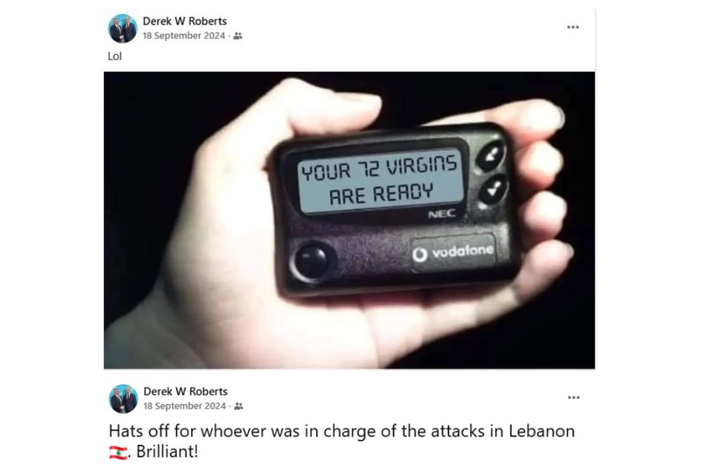In September 2024, when thousands of handheld pagers and walkie-talkies exploded in a coordinated series of attacks, killing and injuring thousands of people, Roberts posted an image of a pager device displaying the words, “Your 72 virgins are ready”.