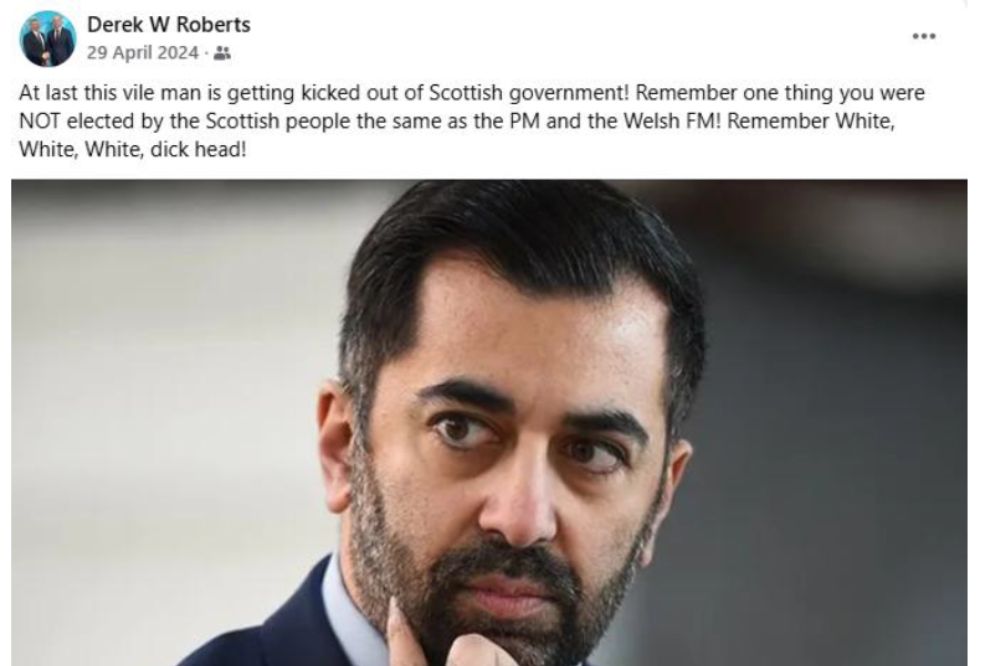 Sharing an image of Muslim former First Minister of Scotland Humza Yousaf, Roberts wrote: “At least this vile man is being kicked out of Scottish government.