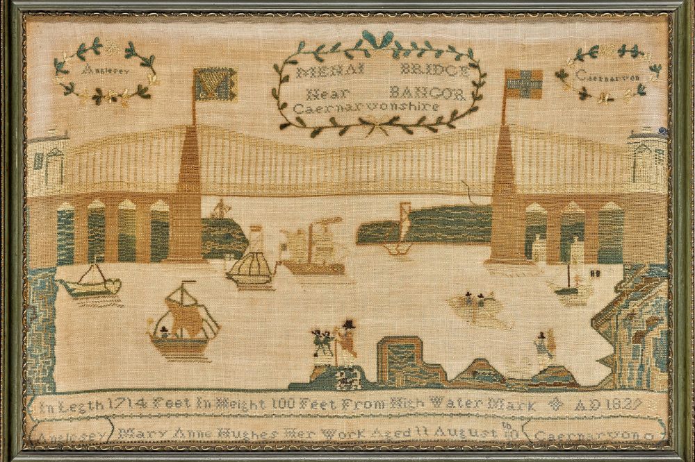The needlework sampler of Menai Bridge and boats crossing the Menai Strait was created in 1829 by Mary Anne Hughes – an 11-year-old schoolgirl.