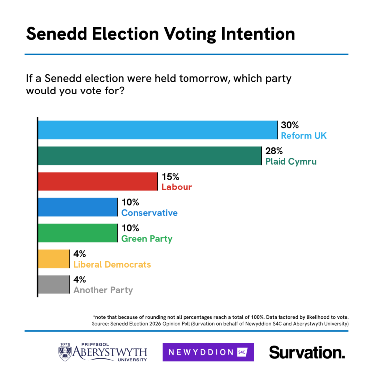 A survey conducted by Survation for Aberystwyth University and S4C puts Reform on 30%, with Plaid close behind on 28%.