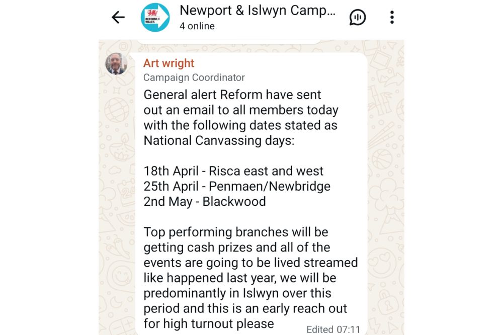 The source also provided Nation.Cymru with a screen grab of a text message sent to one of Reform’s internal WhatsApp campaign group chats.