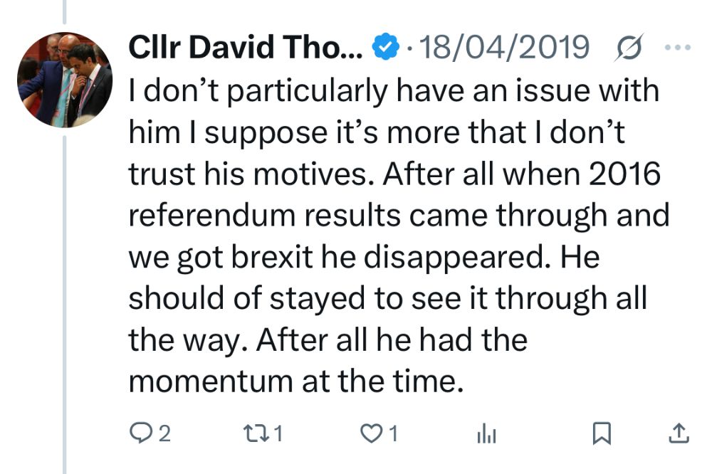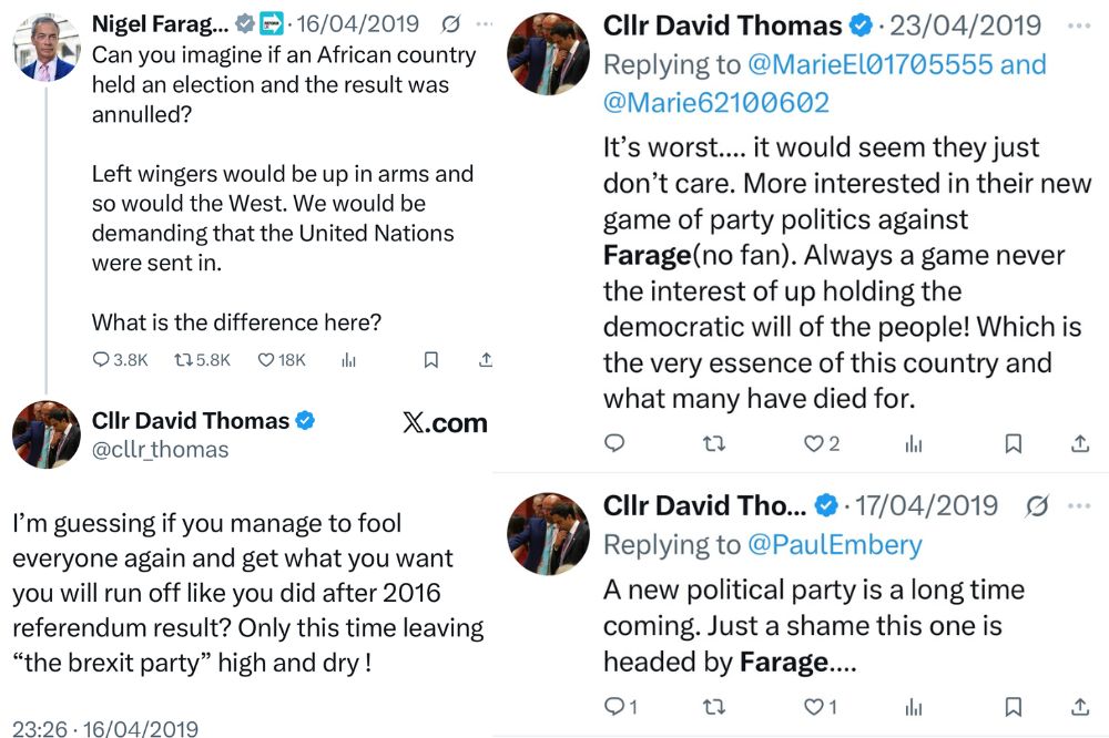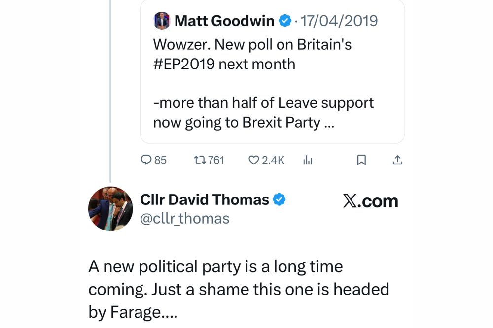 During April 2019, in a discussion about the newly launched Brexit Party – now known as Reform UK – Cllr Thomas wrote: “A new political party is a long time coming.