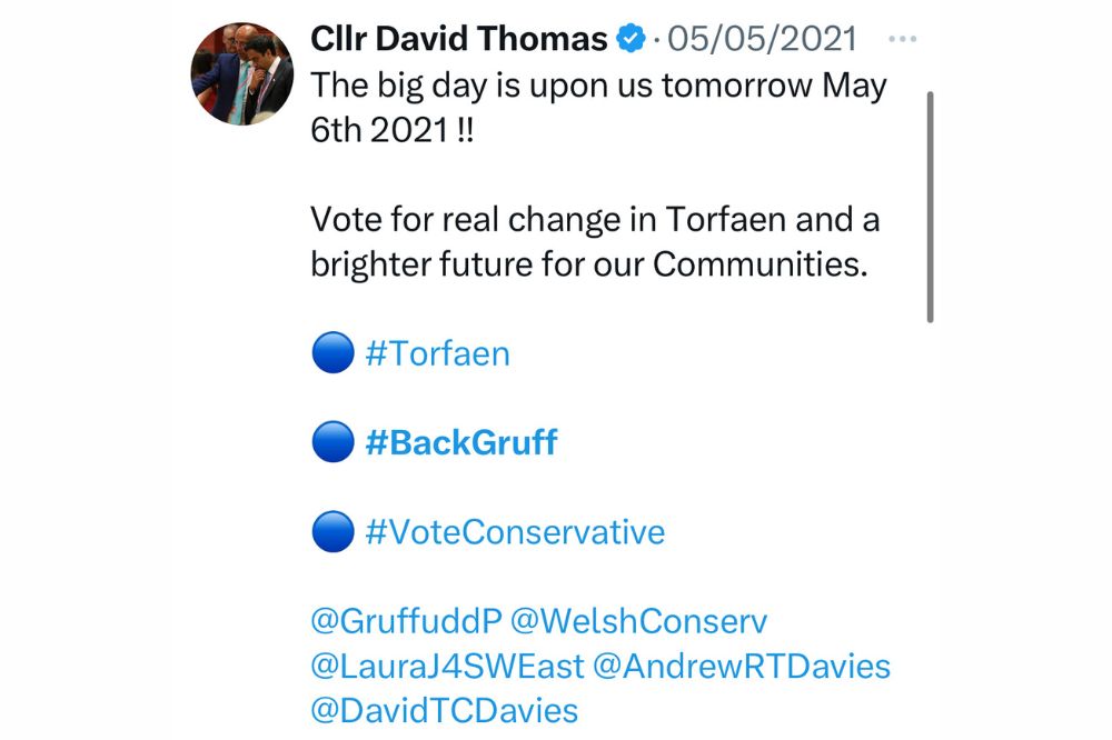 Two days before the vote on May 5, Thomas published a video to Twitter pleading with voters in Torfaen to trust him and lend their vote to the Welsh Tories.