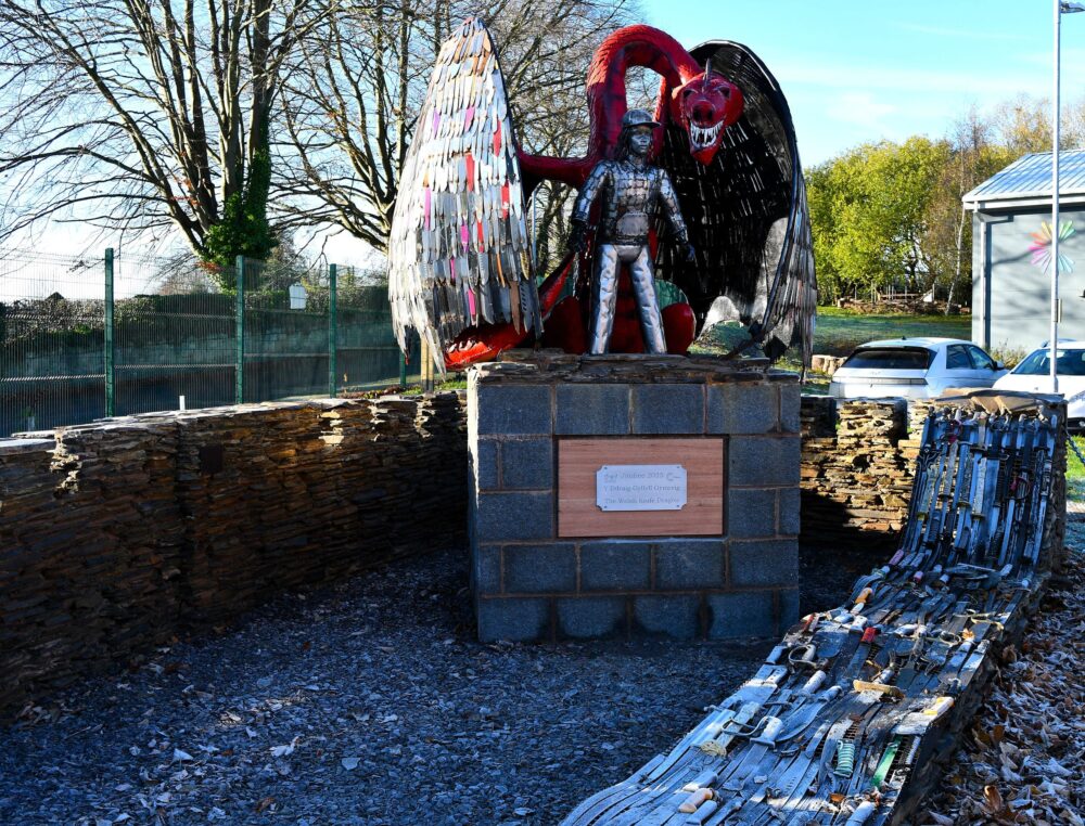 The hand-crafted knife dragon at Coleg Cambria’s Bersham Road site in Wrexham is shown protecting a small child, representing both the creativity and compassion of the community.