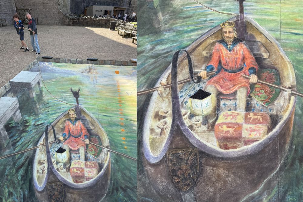 Commissioned by Cadw and created by world-renowned chalk artist Julian Beever, the optical illusion provides a window into the past, showing Llywelyn, the ‘real prince of Wales’ returning to Gwynedd – bringing Welsh history to life.