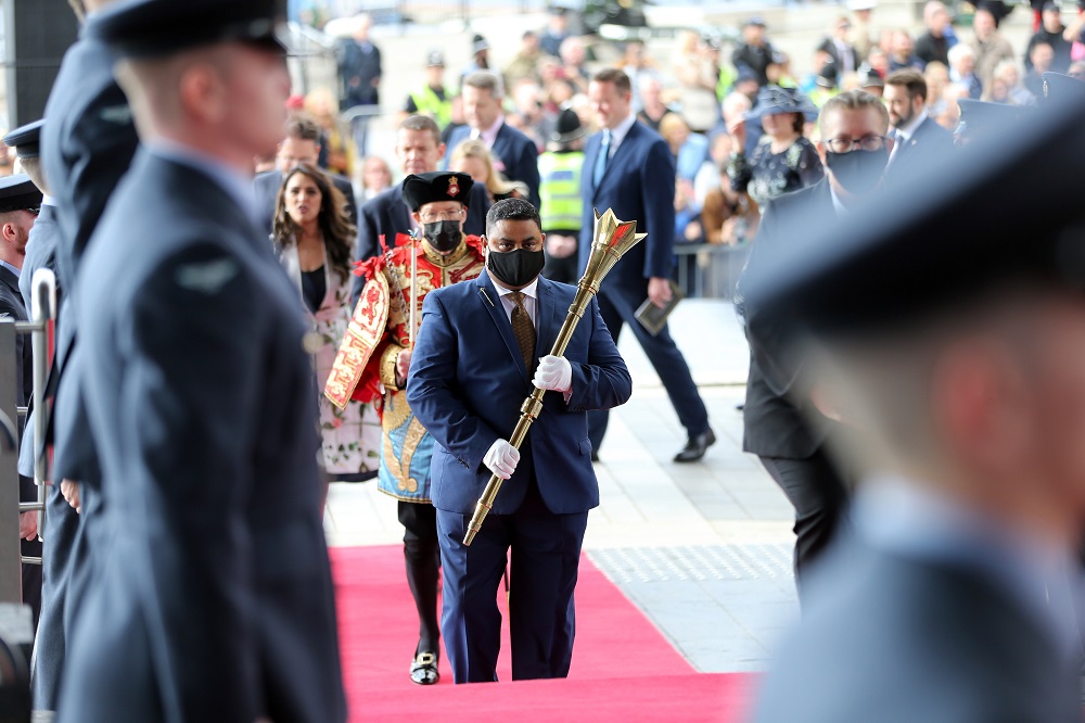 She was then met by First Minister Mark Drakeford, an avowed republican, and the Llywydd Elin Jones, before mace-bearer Shaz Khan led her into the debating chamber.