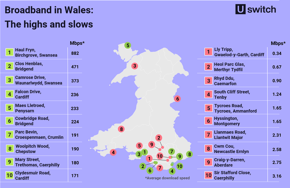 “Residents of this year’s fastest street, Haul Fryn, could download a film in 47 seconds – where it would take those living in Llys Tripp more than 33 hours to do the same thing.