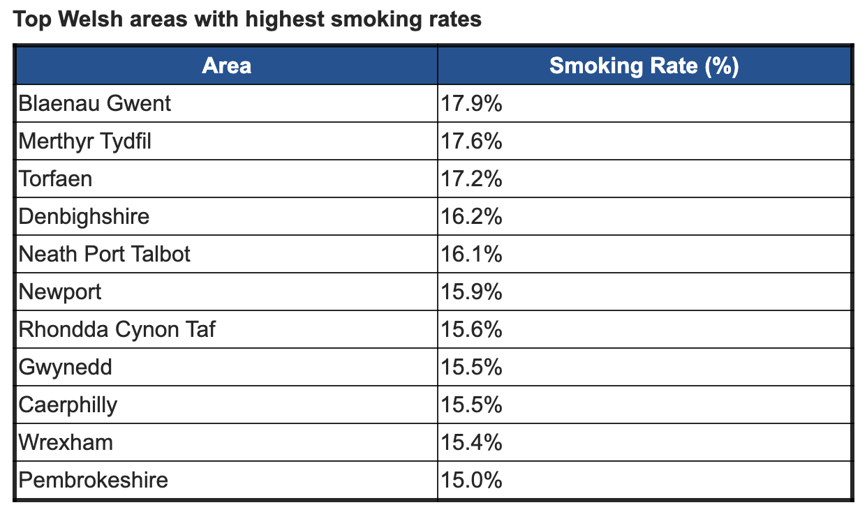 According to the findings, Blaenau Gwent has the highest percentage of smokers in Wales, with 17.9% of residents currently smoking.