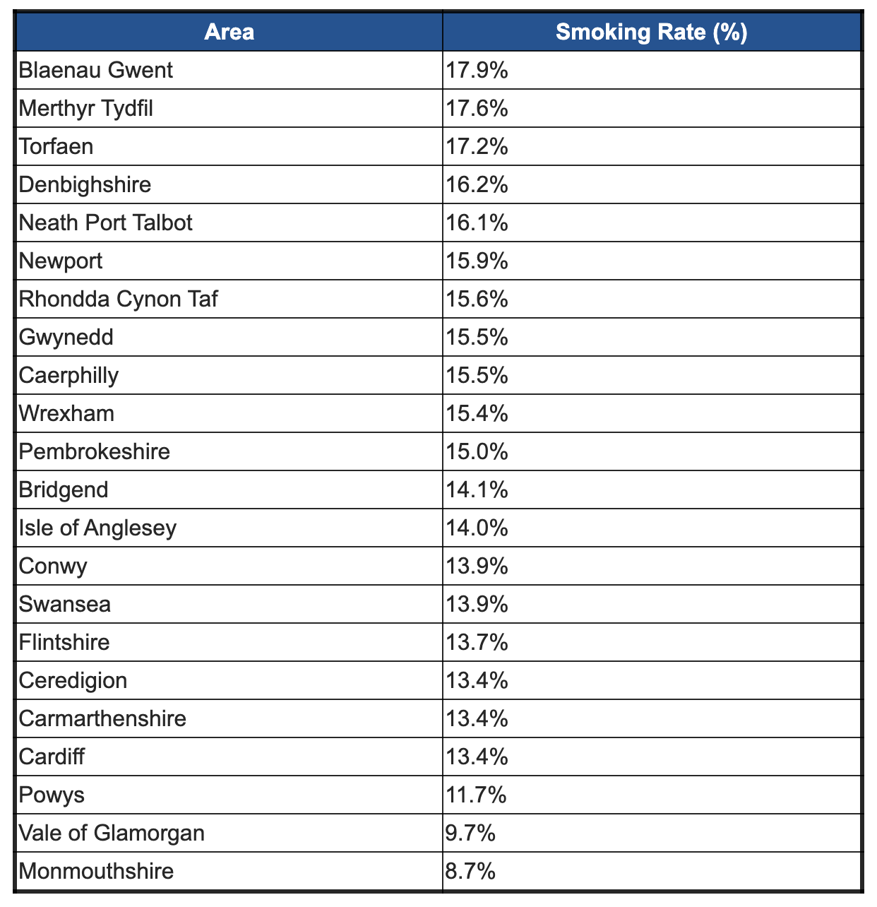 Denbighshire is fourth with reported smoking rates of 16.2% and Neath Port Talbot follows closely behind with 16.1%.