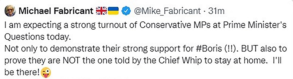 Michael Fabricant tweeted that there would be a “strong turnout” of Tories attending Prime Minister’s Questions on Wednesday to prove they are not the unidentified man told to stay away from Parliament.