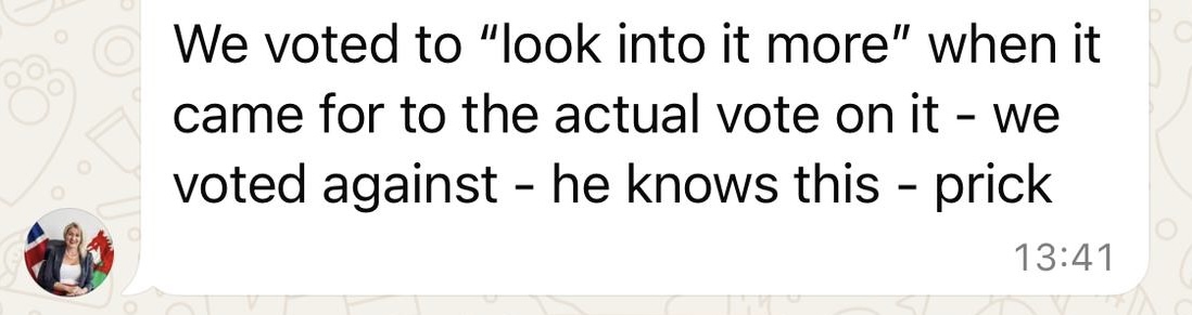 Responding to a screen grab of the tweet, Ms Jones wrote: “We voted to ‘look into it more’ when it came for to the actual vote on it – we voted against – he knows this – prick.”