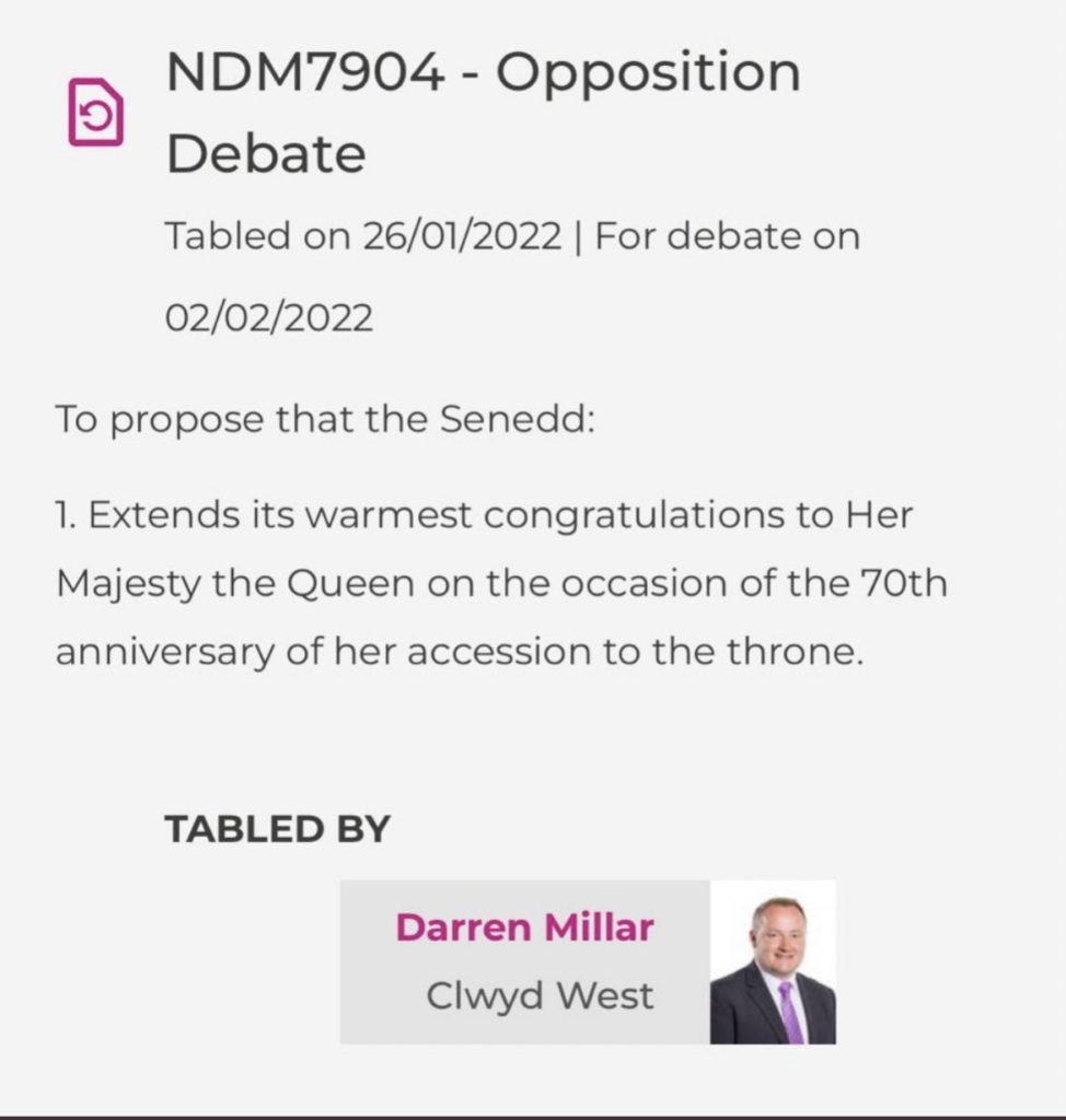 The proposal for the opposition debate by the Welsh Conservative Senedd member, says: “To propose that the Senedd: 1. Extends its warmest congratulations to Her Majesty the Queen on the occasion of the 70th anniversary of her accession to the throne.”