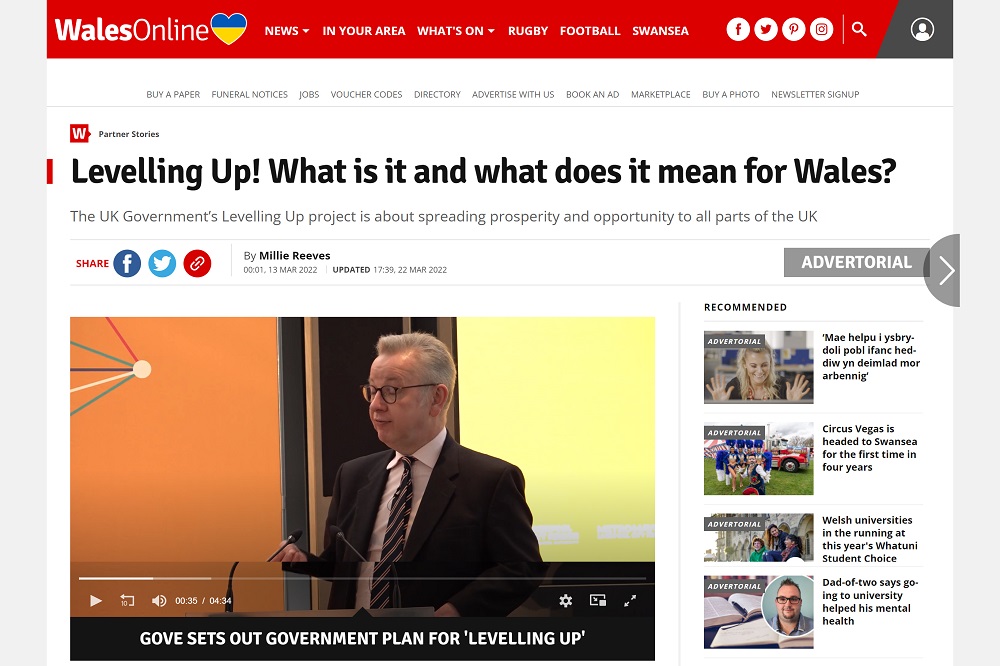 They carried the headline “Levelling Up! What is it and what does it mean for Wales?”, the text “By Millie Reeves Commercial Writer”, a grey box with the word “advertorial” in block capitals and an infographic including the HM Government logo.