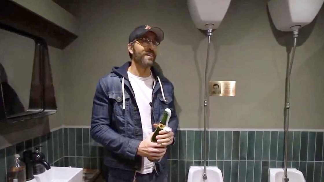 In the video, Ryan Reynolds said: “Today we celebrate Mr Co-Chairman Robert Lucinda McElhenney with this memorial urinal,” the Canadian-born actor says before cutting the bow on the commemorative plaque and popping a bottle champagne.”