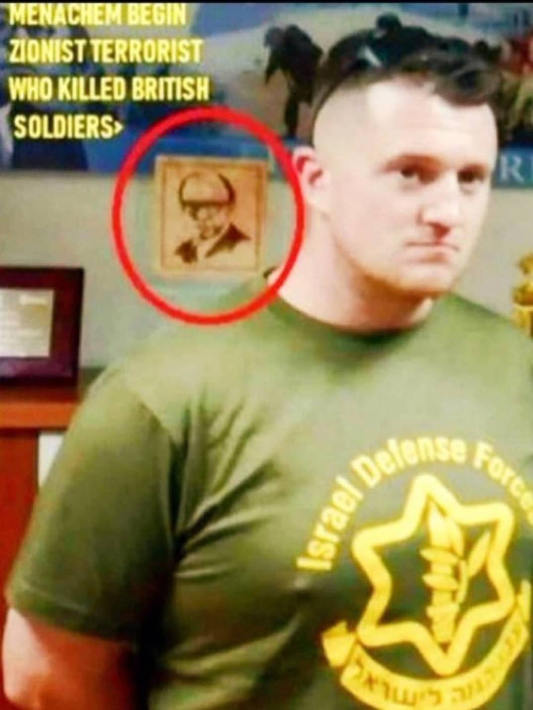 Your hero with an idf t shirt in isreali barracks in front of a zionist terrorist who who murdered British soldiers. To help create Isreal