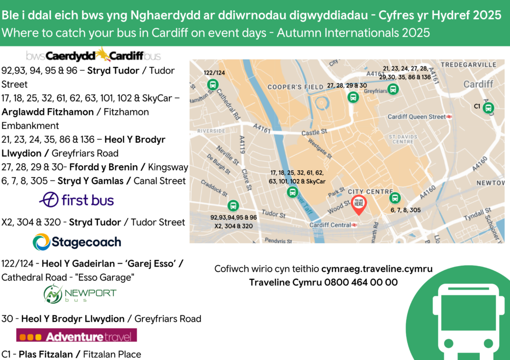Cardiff Bus Interchange will close in line with road closures for each rugby fixture with bus services operating from satellite locations. Cardiff Queen Street will also close, except for accessible access and passengers who wish to travel to Cardiff Bay.