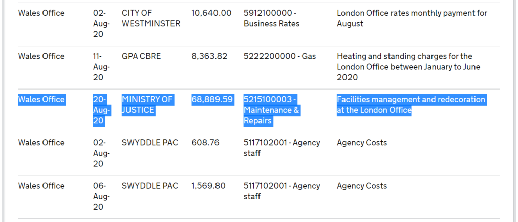 The controversial spending is revealed in UK Government transparency data which shows the Wales Office paid £68,889.59 for “facilities management and redecoration at the London Office” on August 20.