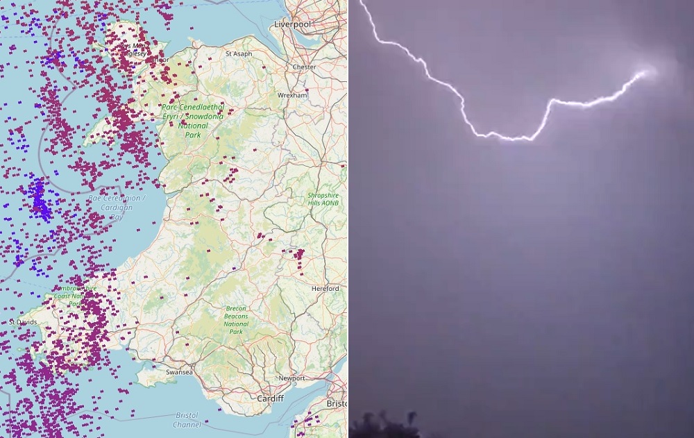 Lightning maps showed that Pembrokshire and the Llŷn Peninsula were hit by thousands of lightning strikes, but the light show was visible from far inland in mid-Wales as well.