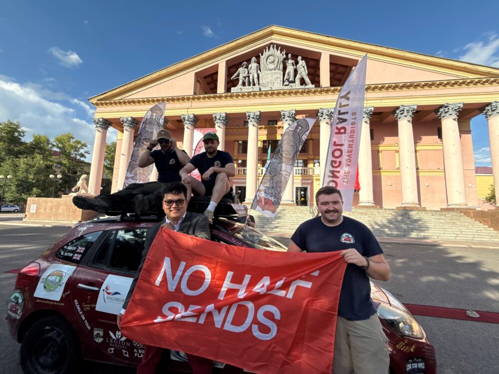 But spirits stayed high. The friends turned the final push to the finish into a “Top Gear-style” race – with George and Hua Ying coaxing the wounded Clio to Oskemen while Tom and Jon flew and took a train. Against the odds, the car made it, and George’s half of the team arrived first.