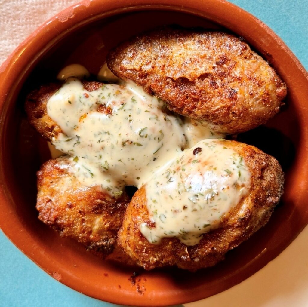 Whilst PETA claims that vegan foods have a smaller carbon footprint it should be noted that the soya bean paste that makes fake chicken wings are grown on land felled of the amazon rain forest, then imported and the buttery mash served along side, contains no butter as coconut oil from Indonesia is used instead.