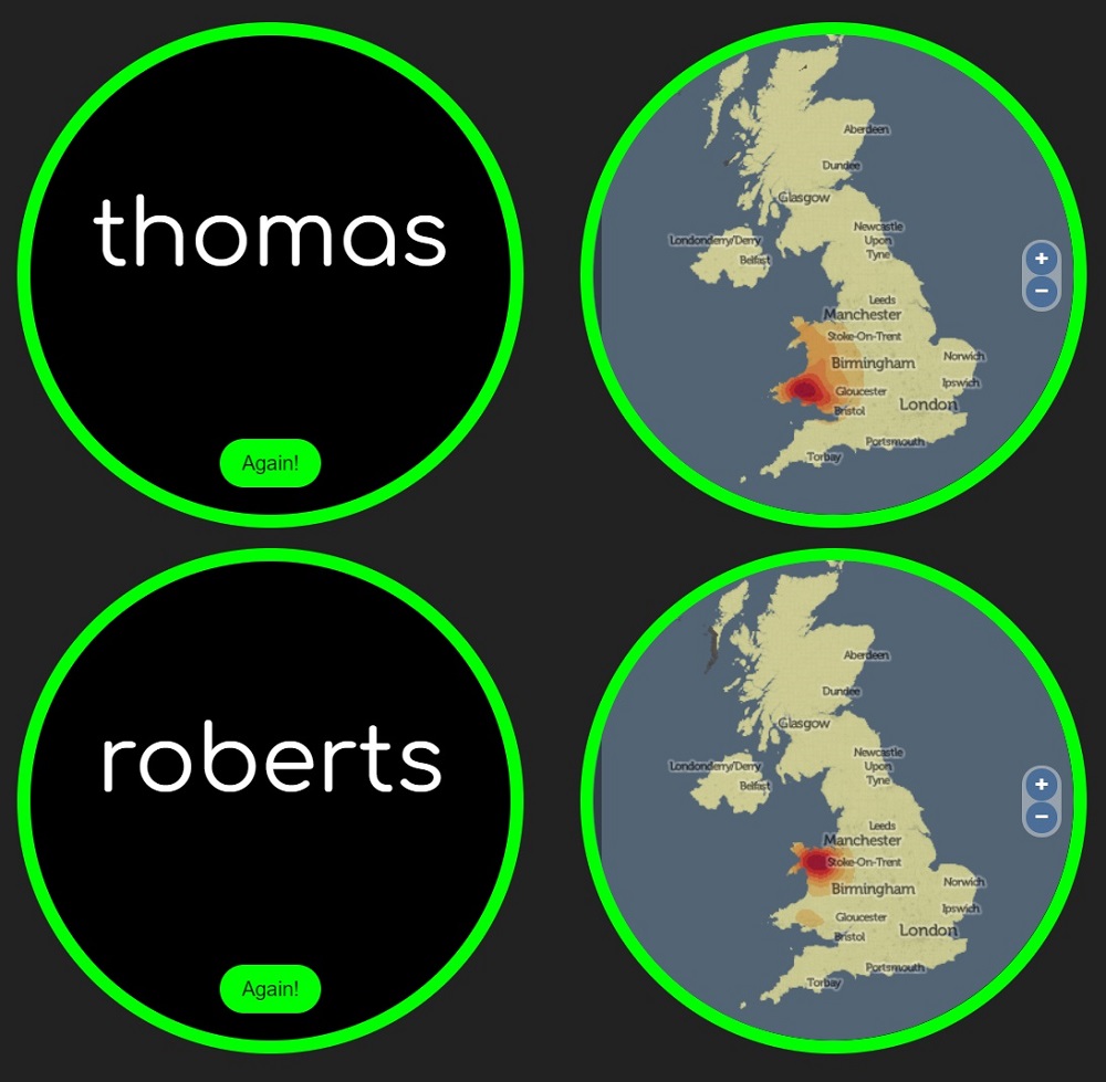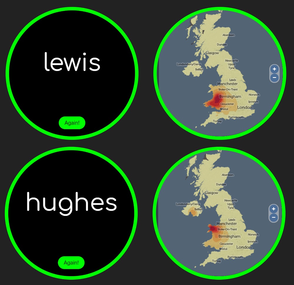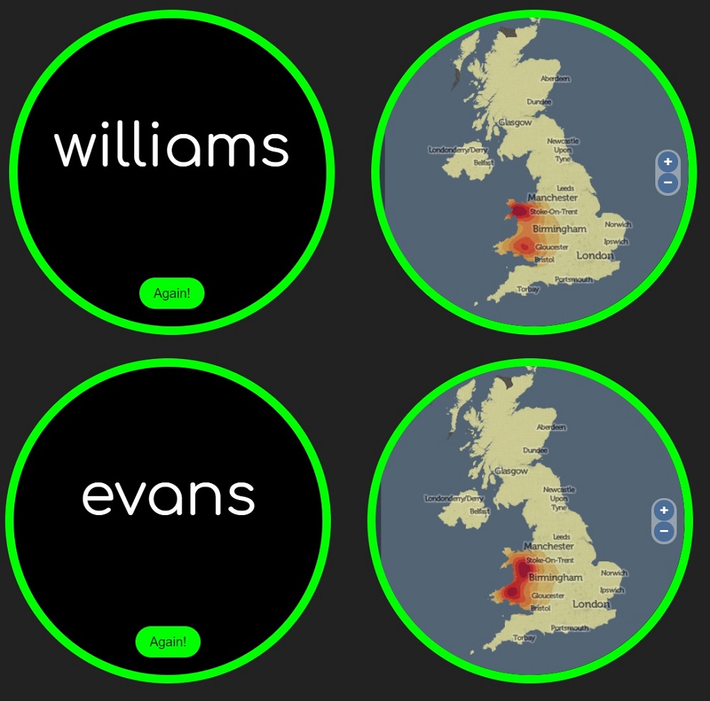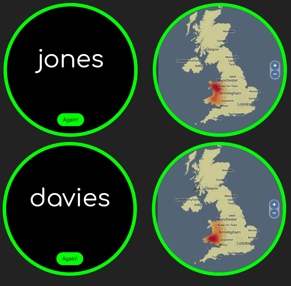 “This doesn’t work for all names, however. The geography of many popular family names (like Smith or Brown) is much more evenly spread, although even popular names like Jones, Williams or Davies still have strong regional connotations.”