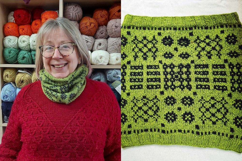 “Our cowl is knitted in the round, using the two-handed stranded colourwork method with the contrast colour held in the dominant hand and the main colour in the other, although any method of working two colours across a row can be used.”