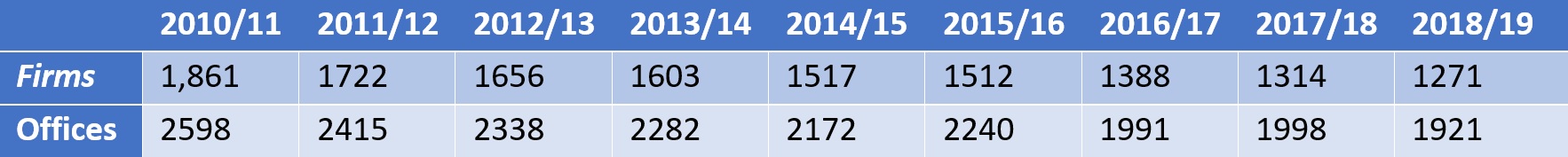 The table below, produced via Written Questions to the Secretary of State for Justice in 2019, demonstrates the decline in England and Wales.