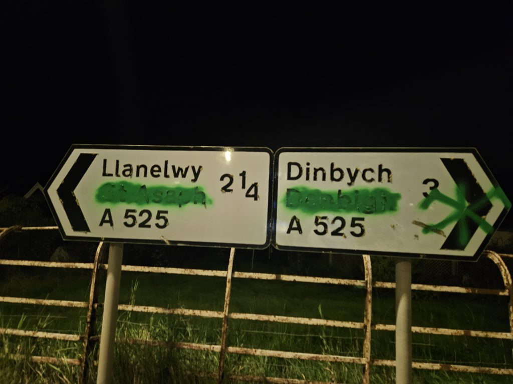 In August 2024, the protesters targeted the Anglicised names ’St Asaph’, ‘Ruthun’ and ‘Denbigh’, leaving behind only the indigenous Welsh names (Llanelwy, Dinbych and Rhuthun).