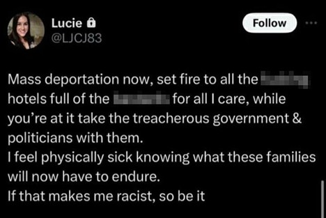 Whilst the content of her tweet allows for no doubt regarding guilt, the GB News/Talk TV/ Reform UK end of political commentary has been volubly outraged by the racist’s sentence.