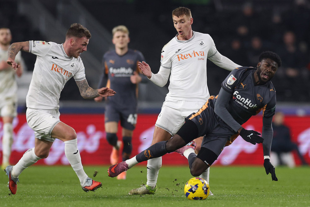 Swansea were grateful to Ben Cabango backheeling away Bobby Clark’s cross into a packed goalmouth, but Derby punished slack marking from their next attack after 34 minutes.